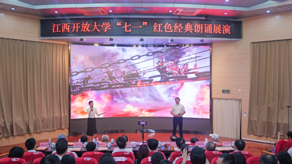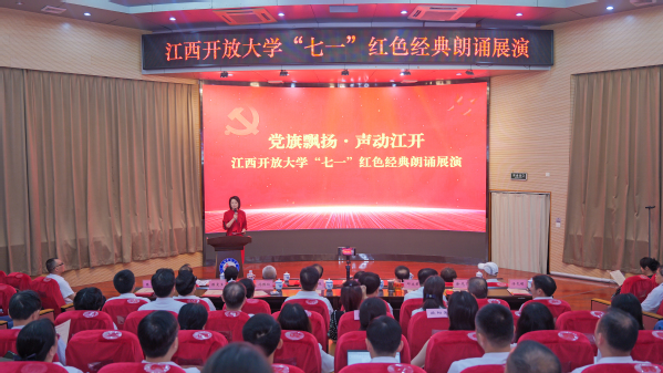 表彰大会结束后,学校携手江西省朗诵与语言艺术协会开展“党旗飘扬·声动江开”红色经典朗诵展演活动,以红色经典诵读回忆初心,感怀党恩,礼赞伟大祖国。朗诵者们围绕革命历史、英雄事迹、精神传承等核心主题,以创新多元的诵读形式和丰富饱满的诵读内容,让每一个节目都充满了感染力和号召力。歌舞与诵读的鲜活融合,合诵中声情并茂的演绎,现场观众沉浸其中,被朗诵者们的精彩表现深深打动,唤起了深刻的情感共鸣。