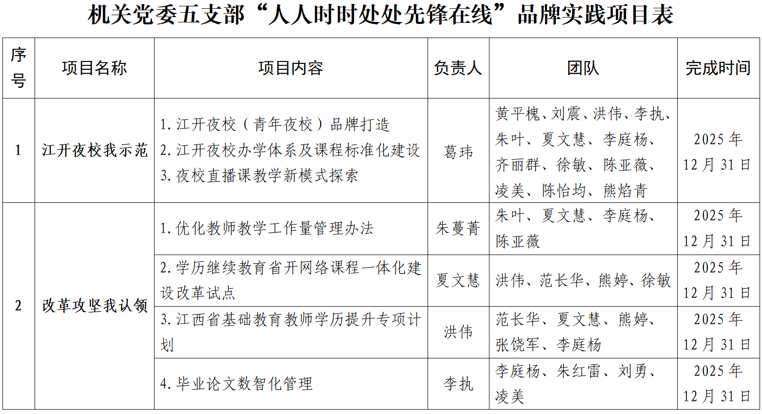 为推动党建业务充分融合,支部立足所辖教务处、教学质量评估中心、终身学习服务中心的业务工作,引导党员干部参与先锋系列活动,积极认领“有我”项目。目前,支部已建立10个“有我”实践项目,主要包括江开夜校(江西青年夜校)品牌打造、优化教师教学工作量管理办法、江西省基础教育教师学历提升专项计划等,同时明确项目负责人及团队成员,共同推进项目建设工作。一是江开夜校取得新成效。2025年,江开夜校依托“一校两点”持续扩大服务范围,实现开课数、服务人数双提升。党员团队牵头探索线上线下教学模式,与东湖区团委、江西生态地址大队、南航校友会密切合作,全年开展培训近50班次,开设3场直播,覆盖学员3000余人次,获得学员一致好评。二是高质量承接乡村教师培训项目。党员同志全力以赴、认真筹备项目投标工作,积极构建“学历+能力”双轨育人模式和完善的跟踪服务保障体系。最终从数家竞标单位中脱颖而出,被遴选为江西省2025年度“国培计划”-乡村教师学历与能力提升衔接培训项目承办单位。三是全力提升学习支持服务。聚焦构建全省开放大学系统“统筹管理—机制联动—培训赋能—考评促优”协同高效的学习支持服务体系,出台《关于提升全省系统高等学历继续教育学习支持服务质量的若干措施》,持续做优高等学历继续教育等。四是修订教学工作量管理办法。着眼学校人员分流、改革发展的现状,支部党员勇于担当、迎难而上,充分调研教师实际情况,认真谋划教师工作量构成,多次与学院开展座谈会,深入探讨教学工作量管理办法设置内容,现已形成《教学工作量管理办法》征求意见稿。
