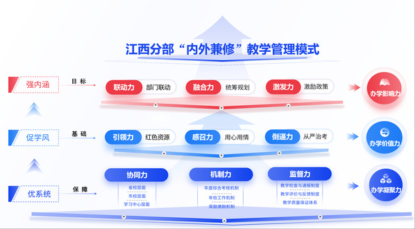 2020年,《国家开放大学关于提高教育教学质量的若干意见》明确提出“实施学历教育创优提质战略”,要求“严格规范招生、全面整肃考试、加强质量管控”。如何实现创优提质?江西开放大学《“十四五”发展规划及二〇三五远景目标》提出“坚持内涵发展,加强教学基本建设,全面深化质量提升综合治理工程”。江西开放大学2022年第一次党代会提出“整合职业教育优质师资、课程、平台等资源,聚焦学科、专业、课程建设关键能力,高效赋能开放教育内涵式发展”。学校在教学管理过程中探索形成了内、外力相作用的“内外兼修”教学管理模式,学风、内涵、系统三大建设取得明显成效。