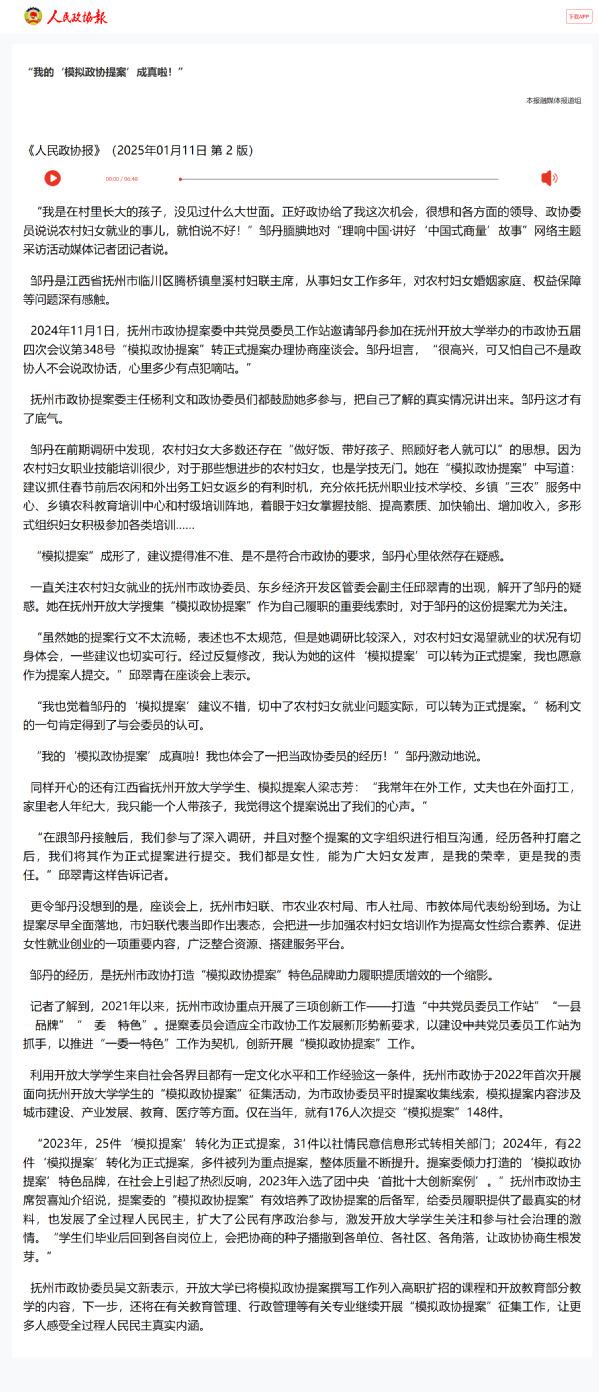 近日,《人民政协报》关注报道了江西开放大学抚州分校学生参与“模拟政协提案”工作。