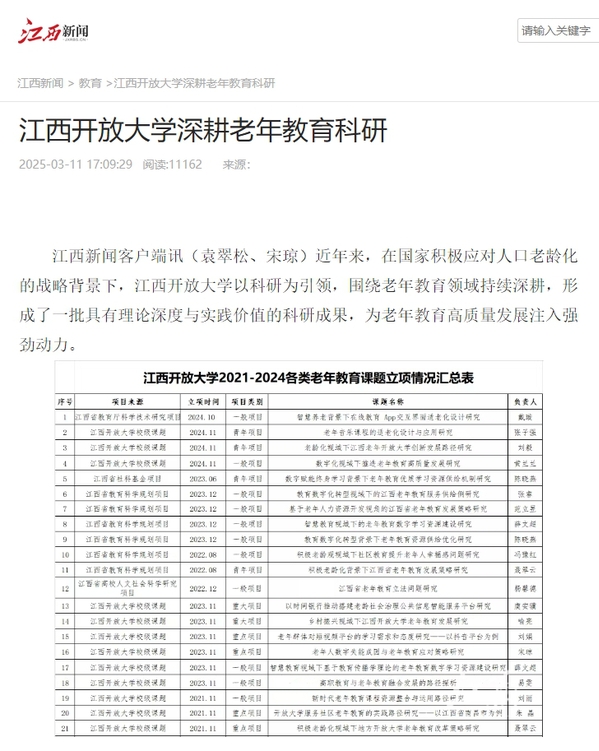 近年来,在国家积极应对人口老龄化的战略背景下,江西开放大学以科研为引领,围绕老年教育领域持续深耕,形成了一批具有理论深度与实践价值的科研成果,为老年教育高质量发展注入强劲动力。