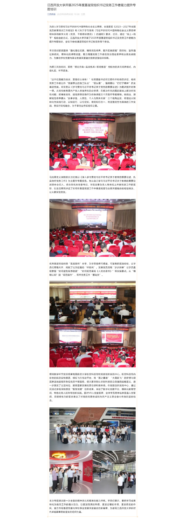 为深入学习贯彻习近平新时代中国特色社会主义思想,全面落实《2023—2027年全国党员教育培训工作规划》和《关于学习使用〈习近平新时代中国特色社会主义思想课程体系和教学大纲(党员、干部培训使用)〉的通知》要求,近日,通过“线上+线下”相结合的方式,江西开放大学开展了2025年度基层党组织书记及党务工作者能力提升专题培训,全校70余名基层党组织书记和党务骨干参加。