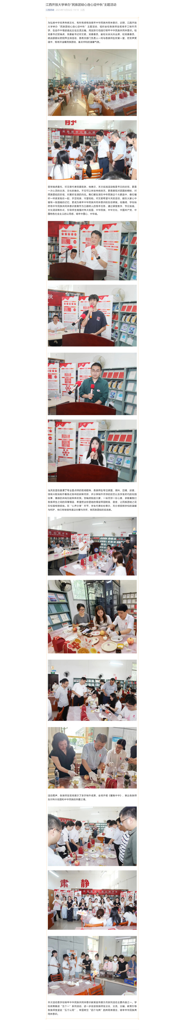为弘扬中华优秀传统文化,有形有感有效铸牢中华民族共同体意识,近期,江西开放大学举办“民族团结心连心迎中秋”主题活动,组织全校各族师生现场手工制作月饼,在合作中增进彼此交往交流交融,用实际行动践行铸牢中华民族共同体意识。校党委书记贺瑞虎,党委副书记邓文君,党委委员、副校长徐光兵出席,校党委委员、统战部部长欧阳萍主持活动,各有关部门负责人一同与各族师生欢聚一堂,在欢声笑语中,现场洋溢着民族团结、喜庆祥和的温馨气氛。