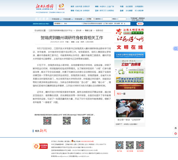 9月17日至18日,江西开放大学党委书记贺瑞虎深入赣州调研新就业群体学习培训、老年教育、乡村教师学历提升培训等工作。校党委委员、组织人事部部长罗军涛,赣州市委教育工委书记、市教育局局长孙传忠,赣州市教育工委委员、赣州开放大学党委书记曾德军,上饶开放大学党委书记王炜等参加调研。