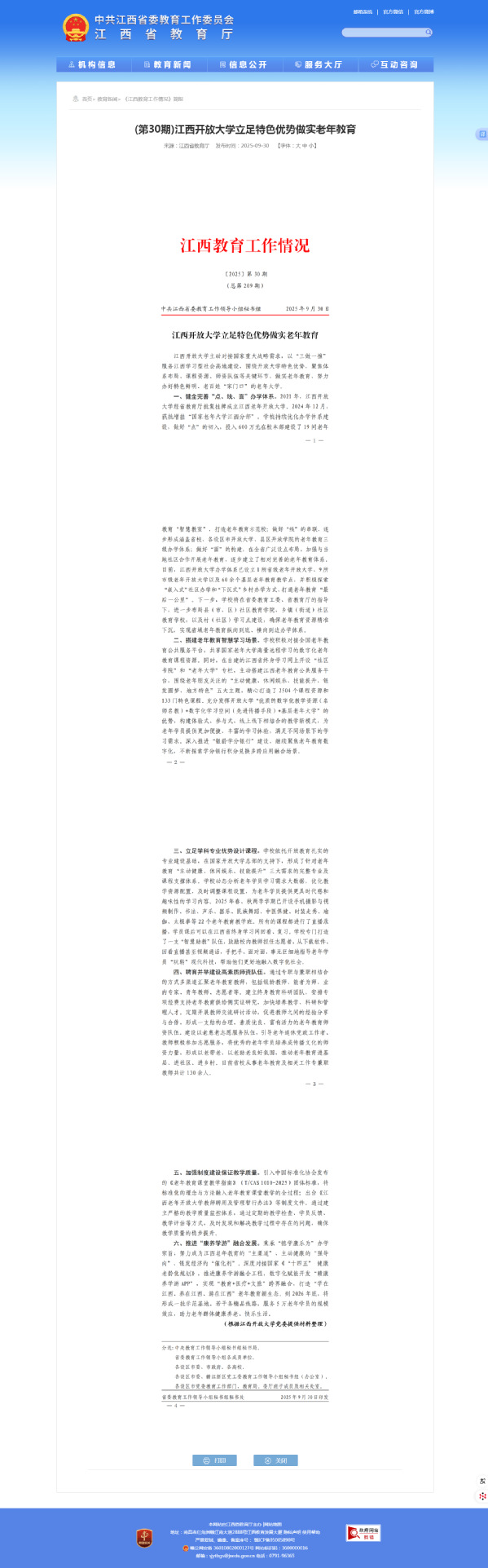近日,《江西教育工作情况》以《江西开放大学立足特色优势做实老年教育》为题,发布我校老年教育工作经验。