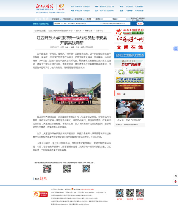 为巩固拓展“学规定、强作风、树形象”主题教育成果,进一步加强经常性的作风教育,深化统一战线成员的思想政治建设,弘扬爱国主义精神、抗战精神、科学家精神,10月9日,江西开放大学各民主党派代表、统战团体成员赴德安县开展实践调研,参观了万家岭大捷纪念园、袁隆平故里,并到德安县开放教育学院调研座谈。校党委副书记邓文君,校党委委员、统战部部长欧阳萍参加。