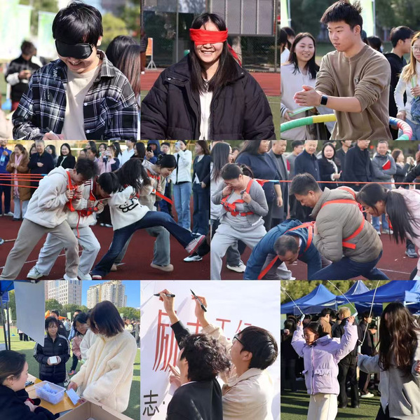 本次运动会创新采用“游园打卡+积分兑奖”的形式,吸引了近800名师生踊跃参与。活动共设置八大趣味关卡和一项集体压轴项目,内容设计巧妙融合心理启发、团队协作、思维激活与体能锻炼,全面激发学生综合潜能。在“极速60秒”中,参赛者争分夺秒完成记忆与速度的双重挑战;“蒙眼互画”环节则考验队友间的信任与默契,不少选手“妙笔生花”,逗趣画面引发阵阵笑声。压轴项目“多向拔河”由各学院学生代表队与教职工队同场竞技,师生同心、全力拼搏,在力量与策略的精彩碰撞中,展现出融洽和谐的师生情谊。现场加油声、欢呼声此起彼伏,田径场化作一片欢乐的海洋。