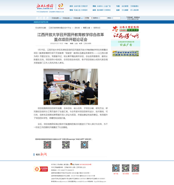 1月19日,江西开放大学在东湖校区组织召开国家开放大学教育教学综合改革重点项目《教育家精神引领下开放教育“双能型”教师队伍建设改革研究——以江西分部为例》开题论证会。党委副书记、校长黄平槐出席并讲话,会议由党委委员、副校长陈爱生主持。项目领导小组成员、总项目组全体成员、各子项目组核心成员代表及相关职能部门工作人员共20余人参加。