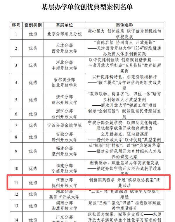 我校报送的案例《数智驱动体系赋能构建开放教育教学质量因子建设新生态》入选“分部以评促建优秀案例”;抚州开放大学报送的案例《创新实践教学 开展“模拟政协提案”征集活动》入选“基层办学单位创优优秀案例”。这两项优秀案例展现了我校在数字化转型、质量保障体系建设、实践育人模式探索等方面的积极实践与优异成果。此次获奖是对江西开放大学办学评估工作及高质量发展成效的充分肯定,也是对全省开放教育体系凝聚合力、开拓创新的有力鼓舞。学校将继续锚定“高质量发展”目标,深化教育教学改革;抓住关键环节质量,以点带面,带动分部整个教学和教学管理全过程质量的不断提升,为构建服务全民终身学习的教育体系贡献更大力量。(图文:发展规划与质量监控处 审校:宁浩 朱蕾 王威)