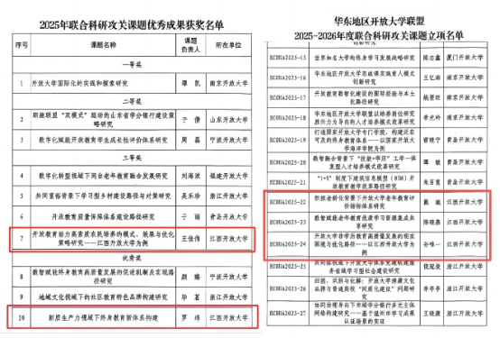 为推动华东地区开放大学科学研究合作、交流与知识共享,联盟理事会一并公布了《关于公布2025年联合科研攻关课题结项名单和优秀成果的通报》,我校推荐申报的2024年度联合科研攻关课题《开放教育助力高素质农民培养的模式、效果与优化策略研究——以江西开放大学为例》荣获三等奖,《新质生产力视域下终身教育新体系构建》荣获优秀奖。