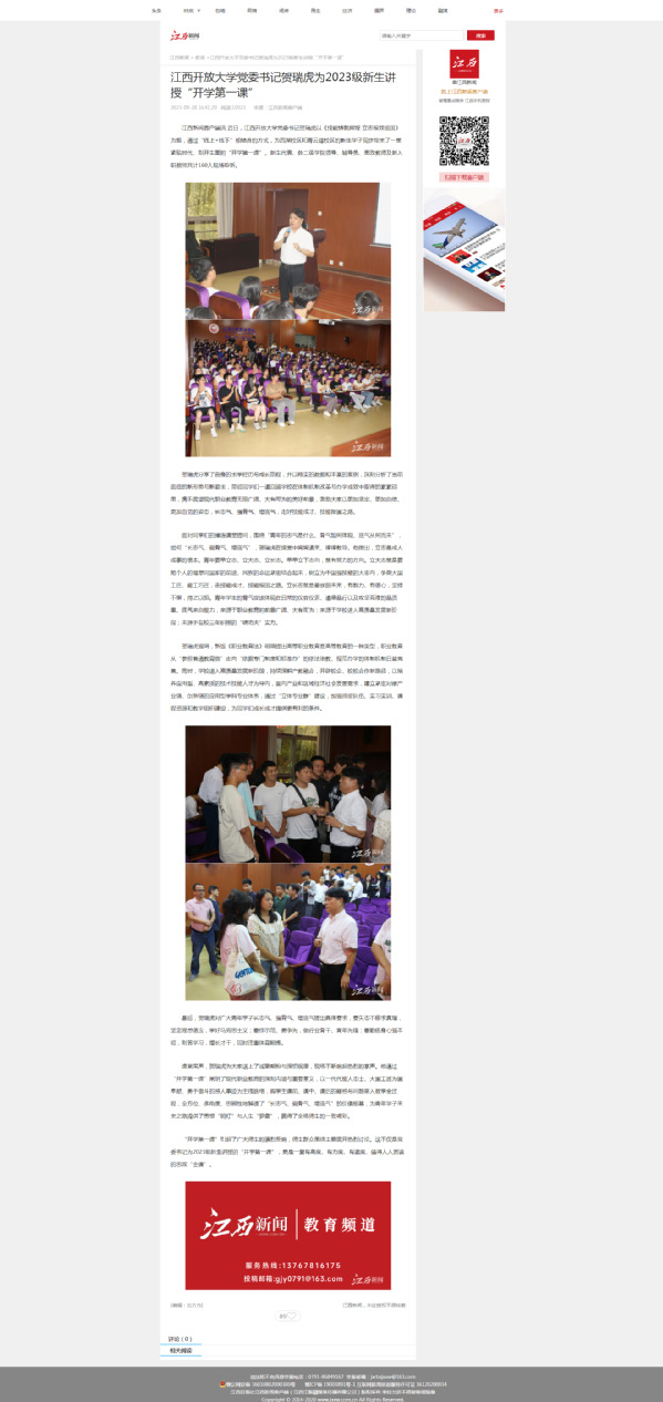 近日,江西开放大学党委书记贺瑞虎以《技能铸就辉煌 立志报效祖国》为题,通过“线上+线下”相结合的方式,为西湖校区和青云谱校区的新生学子同步带来了一堂紧贴时代、别开生面的“开学第一课”。新生代表、各二级学院领导、辅导员、思政教师及新入职教师共计160人现场聆听。