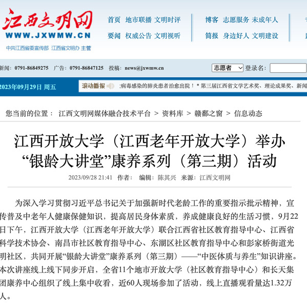 为宣传普及中老年人健康保健知识,提高居民身体素质,养成健康良好的生活习惯,近日,江西开放大学(江西老年开放大学)联合江西省社区教育指导中心、江西省科学技术协会、南昌市社区教育指导中心、东湖区社区教育指导中心和彭家桥街道光明社区,共同开展“银龄大讲堂”康养系列(第三期)——“中医体质与养生”知识讲座。本次讲座线上线下同步开启,全省11个地市开放大学(社区教育指导中心)和长天集团康养中心组织了线上集中收看,近60人现场参加了活动,线上直播观看量达1.32万人。