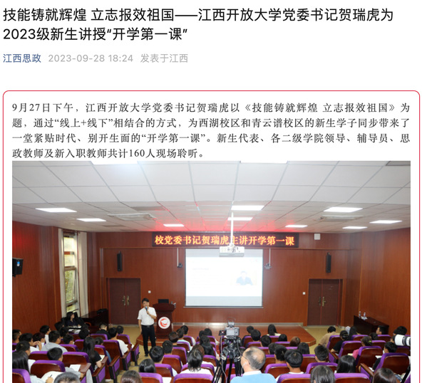 9月27日下午,江西开放大学党委书记贺瑞虎以《技能铸就辉煌 立志报效祖国》为题,通过“线上+线下”相结合的方式,为西湖校区和青云谱校区的新生学子同步带来了一堂紧贴时代、别开生面的“开学第一课”。