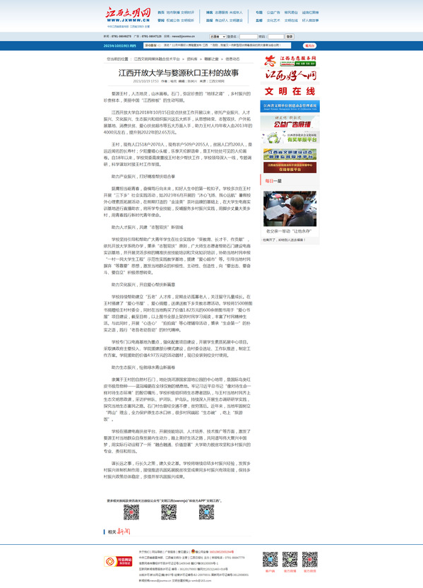 江西开放大学自2018年10月15日定点扶贫工作开展以来,依托产业振兴、人才振兴、文化振兴、生态振兴和组织振兴这五大抓手,从思想转变、志智双扶、户外拓展基地、消费扶贫、爱心扶贫超市等五大方面入手,助力王村人均年收入由2013年的4000元左右,提升到2022年的2.65万元。