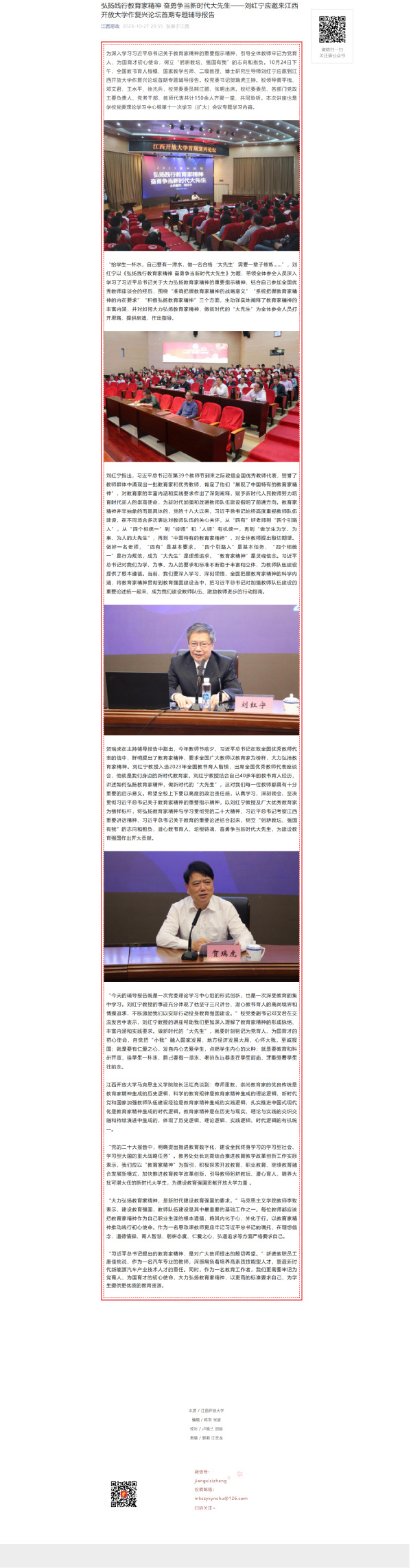 为深入学习习近平总书记关于教育家精神的重要指示精神,引导全体教师牢记为党育人、为国育才初心使命,树立“躬耕教坛、强国有我”的志向和抱负。10月24日下午,全国教书育人楷模、国家教学名师、二级教授、博士研究生导师刘红宁应邀到江西开放大学作复兴论坛首期专题辅导报告。校党委书记贺瑞虎主持。校领导黄平槐、邓文君、王水平、徐光兵,校党委委员熊江鹏、张明出席。校纪委委员、各部门党政主要负责人、党务干部、教师代表共计150余人齐聚一堂、共同聆听。本次讲座也是学校党委理论学习中心组第十一次学习(扩大)会议专题学习内容。