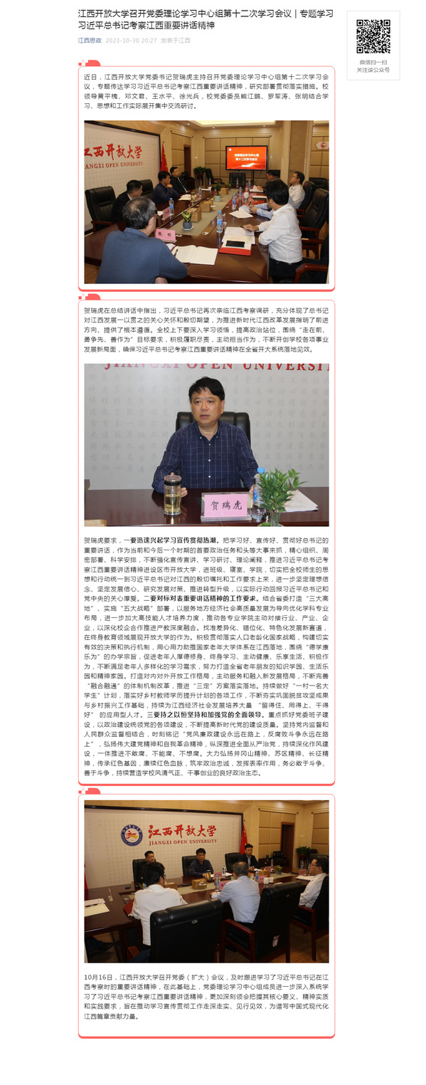 近日,江西开放大学党委书记贺瑞虎主持召开党委理论学习中心组第十二次学习会议,专题传达学习习近平总书记考察江西重要讲话精神,研究部署贯彻落实措施。校领导黄平槐、邓文君、王水平、徐光兵,校党委委员熊江鹏、罗军涛、张明结合学习、思想和工作实际展开集中交流研讨。