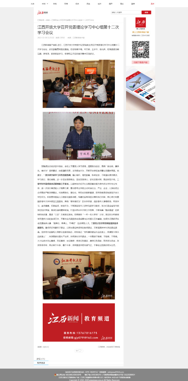 近日,江西开放大学党委书记贺瑞虎主持召开党委理论学习中心组第十二次学习会议,研究部署贯彻落实措施。校领导黄平槐、邓文君、王水平、徐光兵,校党委委员熊江鹏、罗军涛、张明结合学习、思想和工作实际展开集中交流研讨。