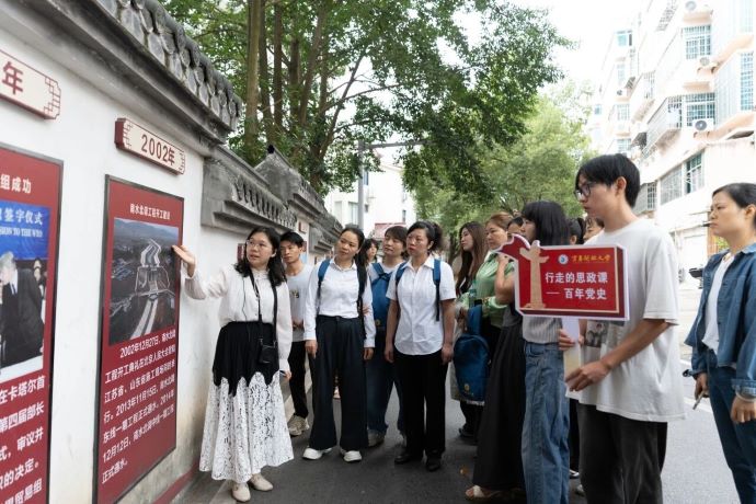 在百年党史文化墙前,张又丹、朱璟、钟倩、徐小可、谢敏红五位青年教师组成的讲解团,依托丰富史料与生动案例,带领新生回顾中国共产党百年光辉历程与伟大成就,帮助大家深刻感悟党的初心与使命。走到红色家书文化墙前,青年党员余春波深情讲述一封封家书背后的故事。革命先辈在字里行间传递的炽烈家国情怀与坚定信仰,宛如跨越时空的精神火炬,深深触动每位新生。大家纷纷表示,将以先辈为榜样,在校潜心学好本领、始终铭记红色初心,未来把知识切实融入实践,为祖国发展贡献力量。