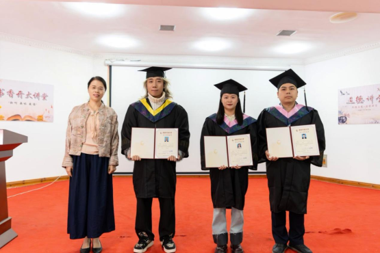 党委书记金文玲为学士学位获得者颁发学位证书并合影留念。