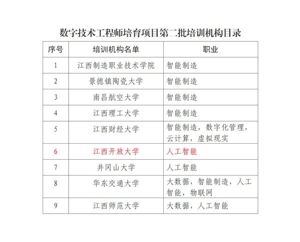 近日,江西省人力资源和社会保障厅公布了江西省数字技术工程师培育项目第二批培训机构目录,我校社会教育学院联合智能技术学院申报的人工智能工程技术人员培育项目培训机构成功获评。