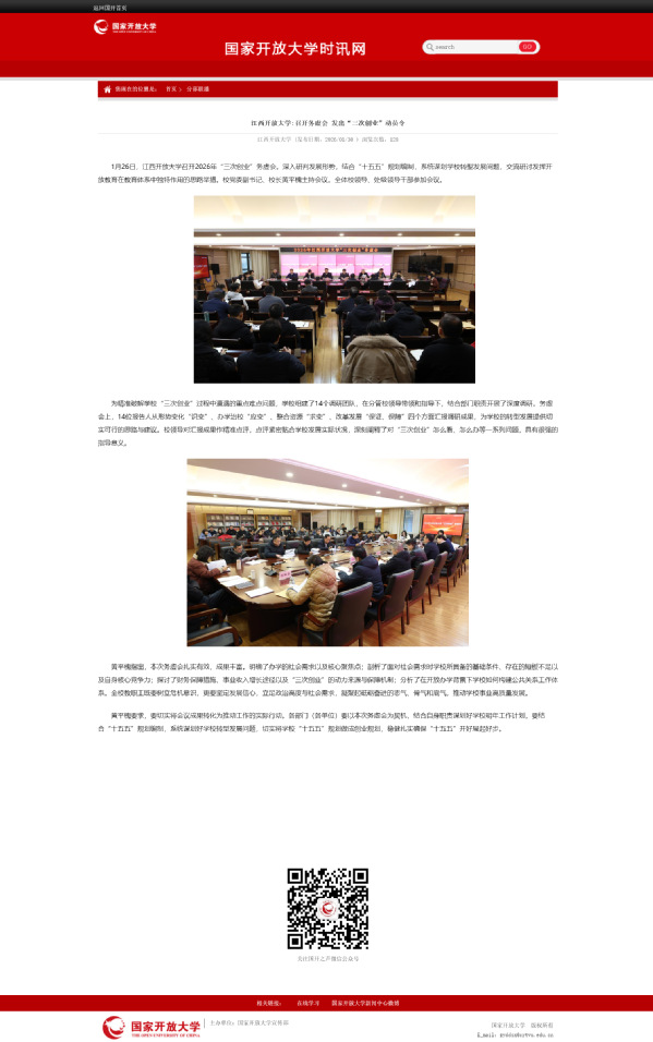1月26日,江西开放大学召开2026年“三次创业”务虚会。深入研判发展形势,结合“十五五”规划编制,系统谋划学校转型发展问题,交流研讨发挥开放教育在教育体系中独特作用的思路举措。校党委副书记、校长黄平槐主持会议。全体校领导、处级领导干部参加会议。