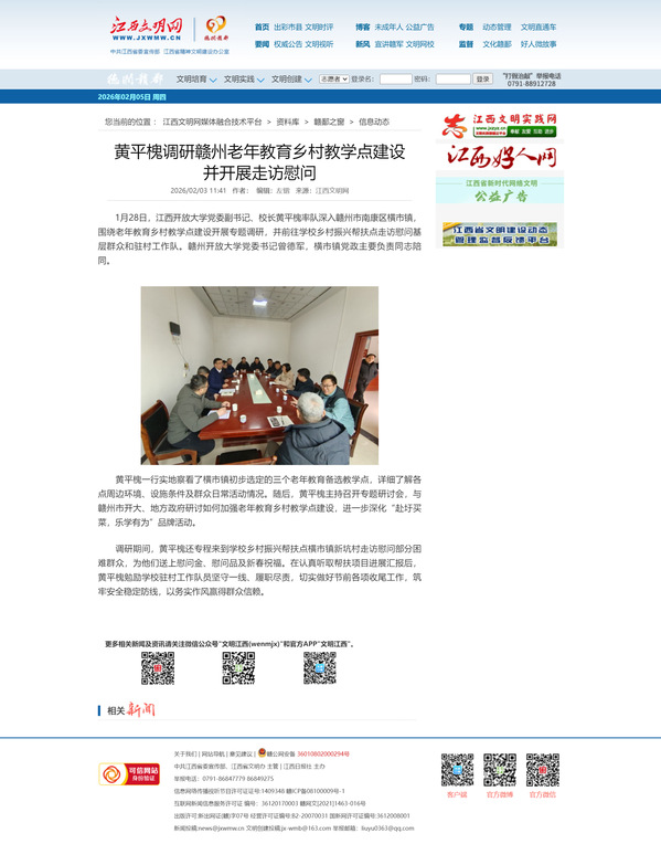 1月28日,江西开放大学党委副书记、校长黄平槐率队深入赣州市南康区横市镇,围绕老年教育乡村教学点建设开展专题调研,并前往学校乡村振兴帮扶点走访慰问基层群众和驻村工作队。赣州开放大学党委书记曾德军,横市镇党政主要负责同志陪同。